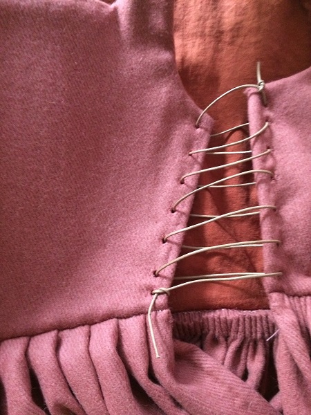 Madder/pink wool kirtle with cotton twill lining, has synthetic cable tie bones in the