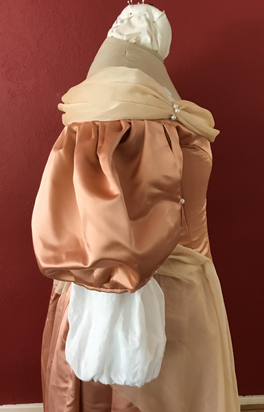 Peach silk satin boned bodice with puffy sleeves laces up back. Sheer gold trim on neckline with tail at end held in place with