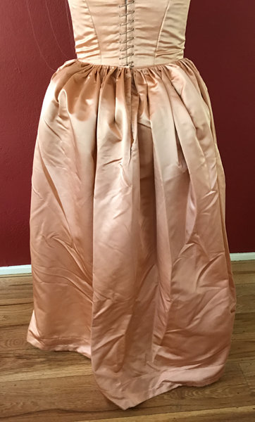 Peach silk satin skirt with narrow waistband, pleats over bum roll, and closes with hooks and eyes.