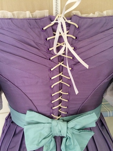 Neck hem is piped and has silk organza trim. Back bodice and waist seams are piped. Originally dress had hooks and eyes in the back, but it gaped open. So, for second wearing, eyelets were handsewn in the