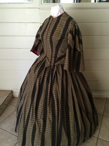 Mid Victorian Reproduction Beige and Black Day Dress was made for a Victorian fancy dress ball with a ruff