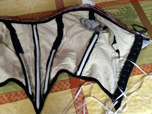back lacing through buttonholes, white polyester satin pleated bertha over a dark red satin,