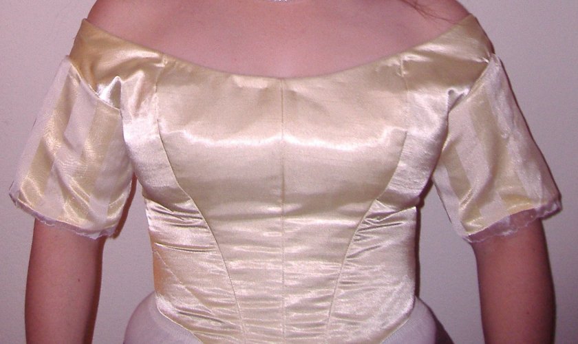 This pattern has very limited arm mobility. Arms end up in a down position which was very fashionable at the time. Pictured is a first try of the bodice with the undersleeve which was very restrictive. Changed the undersleeve to a gathered puff which gives a little more movement but arms still cannot be moved above the head.
