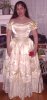 Victorian 1850's style dress for Gaskell's fashioned after a fashion print from Godey's January 1850. Yellow satin ended up lighter than in plate especially with flash photography and flowers ended up larger than in print. A striped sheer was used in place of the lace. Bertha ruffles were more gathered which makes the dress look like a 1940s version of an 1850s dress (think "Gone With the Wind").