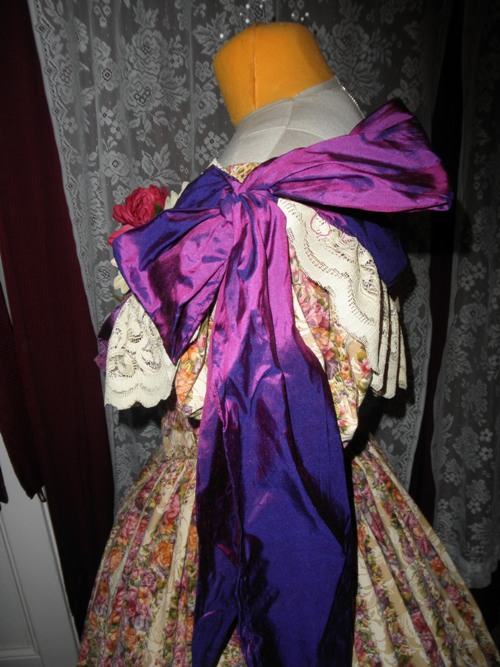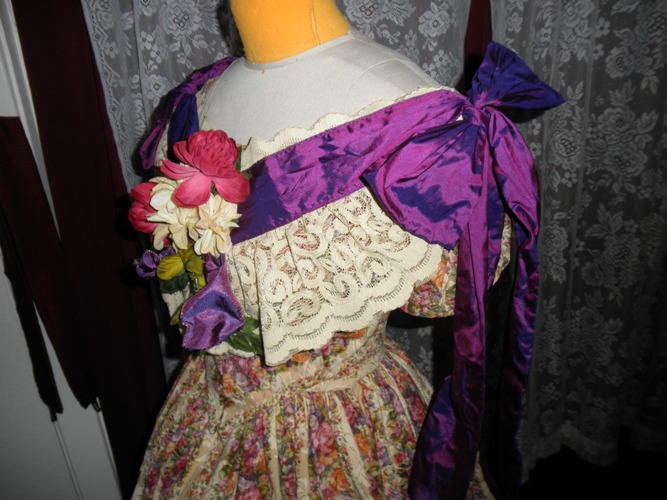 with cap sleeves, lace and purple silk bertha ties on shoulders.