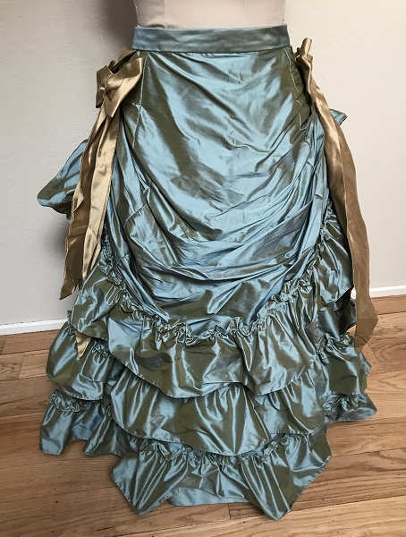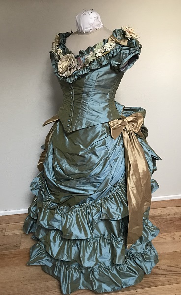 Reproduction 1870s bustle dress made with aqua blue shot with gold silk dupioni taffeta