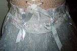 | BowEmbroidered gray polyester organza and gray lace ribbon can be tied to the bodice apron with gray satin ribbons.