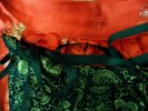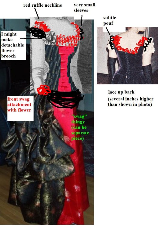 BodiceRed satin chrysanthemum polyester brocade centered in black chrysanthemum polyester brocade with red ruffles on front and neck edge, gathered black chiffon puff sleeves with brocade edging and drawstring ribbon bow on edge, peplum, back-laced through buttonholes, and gold tone buttons on faux front edge. Black trim can be added as faux lacing across front.Pattern base Butterick 3012 . |