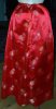 | UnderskirtRed satin chrysanthemum polyester brocade front gored underskirt has larger panel in the back that is gathered in back for more fullness and has hidden back pockets, ribbon drawstring on set waistband, back hook and eye closure.