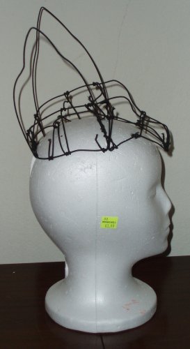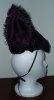 HatBat head hat, wire frame with fur, black and purple polyester taffeta, netting, yellow felt, and animal eyes. |