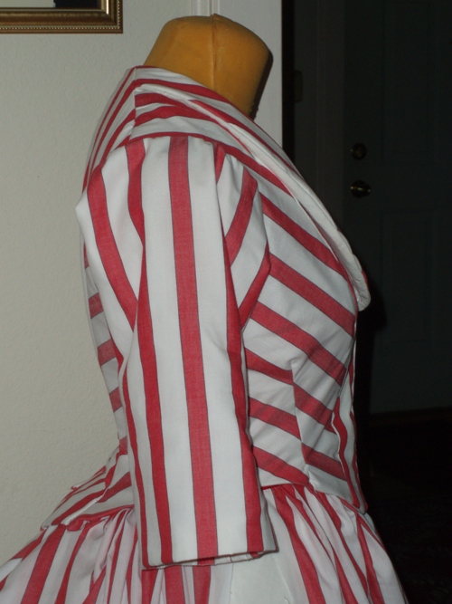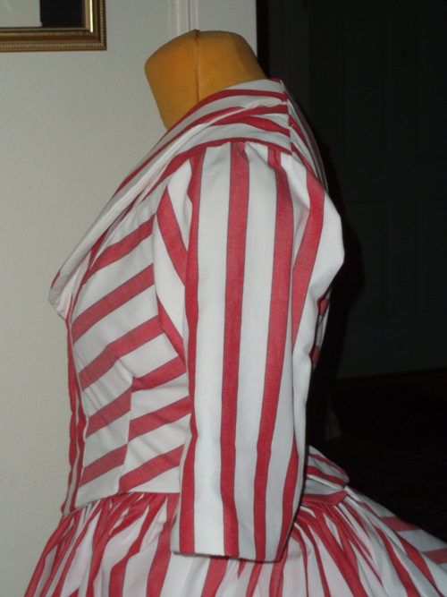 Red and white striped bodice (bolt said cotton, feels like poly cotton shirting blend) on flatlined