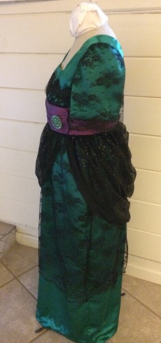 Green polyester satin dress with lace overlay on skirt and sleeves and bodice. Venetian lace on bodice. Sequined
