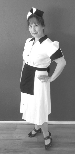 Candy uniform similar to the ones worn by Lucy and Ethel in the chocolate factory episode. Made this one as a pattern tester for the pattern and it did not come with the chef hat, yet. Chef hat is now included in the pattern. So, my version has the little bandette like the one worn by the supervisor and I used black and white like See's Candies uniforms.