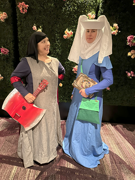 at Costume College 2024. Painted posterboard ax costume for ukulele, red ribbon tippets, and black veil for black hair.
