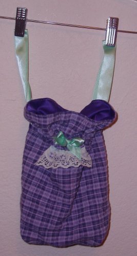 Purple plaid bodice with dark sage green taffeta trim up front and around edges.