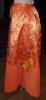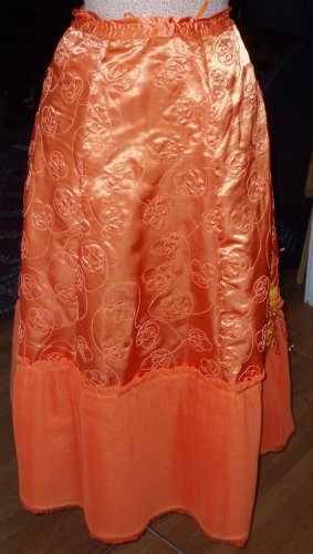 | UnderskirtOrange polyester satin with rope pattern front gored underskirt has larger panel in the back that is gathered in back for more fullness and has hidden back pockets, ribbon drawstring on set waistband, back hook and eye closure. Orange pleated polyester ruffle with orange grossgrain ribbon trim covering gathers.Pattern base Simplicity 5457. Circumference 102" |