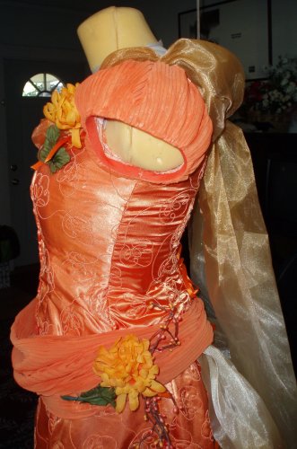 Bright orange bustle dress made for an October Gaskell's Victorian dance. Style more resembles natural form bustles with gathers but non bustle pad. Items constructed for this costume: |