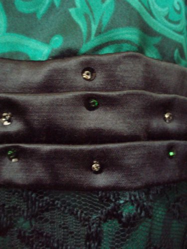 with dark gray satin pleated trim. Black sequins with clear and green beads