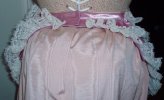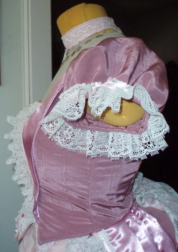 BodicePink moire polyester taffeta bodice, pearlized buttons down front, ribbons lace through buttonholes in back, synthetic gathered lace trim with pink ribbon on front, faux pink polyester satin collar along front, piping on part of front top and bottom edges. Back overskirting pleated into bodice with offwhite lace and pink trim around edges. Part of lace valance on top of back skirt. Artificial roses and off-white ivory ribbons on each side.Pattern base Butterick 3012 . |