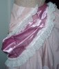 | UnderskirtLighter pink moire polyester taffeta skirt with darker taffeta pleats on bottom edge. Thrift store purchased lace over pink valance. Pink and offwhite crochet trim with hanging beads and shells. Hidden side pockets, skirt pleated into set waistband with inner drawstring, hook and eye back closure.Pattern base Simplicity 5457. |
