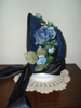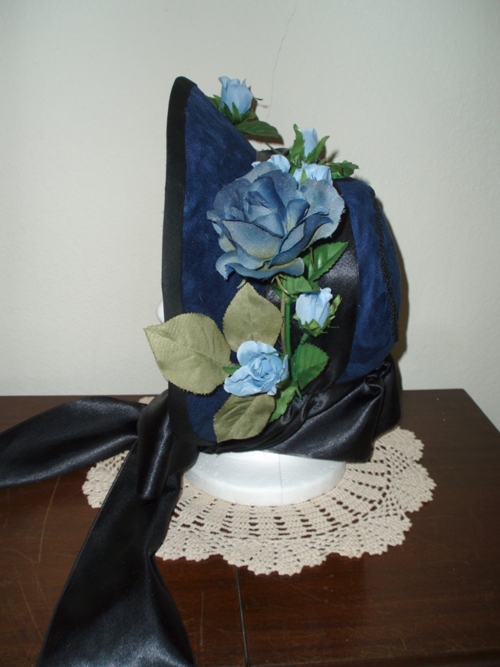 Straw bonnet covered with dark blue polyester suede with black lace front, black 4" ribbon, white floral on inside brim, and blue roses.
