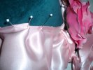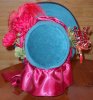 [20111103] Finished covering and trimming one of the straw bonnets that I started. Mostly hot glued. Teal no wale corderoy with pink silk trim and silver polyester satin ties. White ruched inside. Turned out okay so feel a little better about sewing quality. Hopefully sewing will continue strong for the buckram and silk bonnet.
