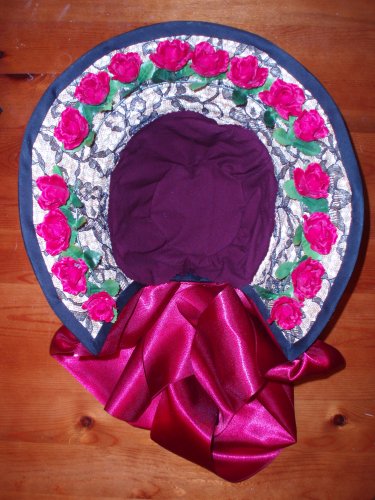 [20170903] My eye for more historical bonnets has improved since creating this tutorial. What seemed lovely when I first started, now is wrong for historical reenactment. If you want your bonnets to look slightly more historical, do not use obvious big plastic flowers. On the inside of the brim, try to find smaller, paper or fabric flowers. Do not use flat lace as trim on the inside of the brim. (Oops! Sorry, younger self, those big roses and black lace have to go.) Either leave plain gathered up cotton lace for trim.