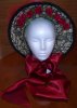 velvet with black lace front, red 4" ribbon, red rose and apples on one side, red