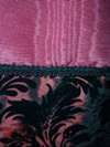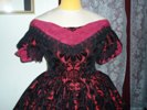 back burgandy satin ribbon lacing through buttonholes, burgandy moire polyester taffetta bertha with black lace on bottom hem, puffed sleeves, bodice fabric