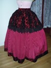Burgandy polyester taffeta with black velvet print overskirt sewn to burgandy moire polyester taffeta underskirt and cartridge pleated into set waistband. Has back