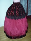 hook and eye closure, hidden side pockets, black lace trim on overskirt, black velvet taffeta trim on bottom hem has black braid trim
