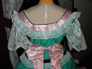 Teal synthetic brocade bodice with pink satin pleated bertha, piped in black satin, white ruffled lace on