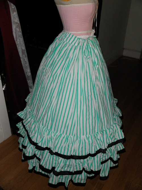 Teal and white striped cotton gathered skirt with drawstring waistband and three flounces with black polyester satin trim.