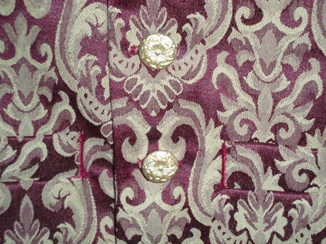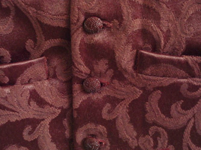 Burgandy brocade with same fabric on collar, cotton lining, fashion buttons.
