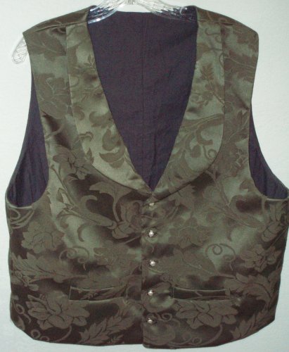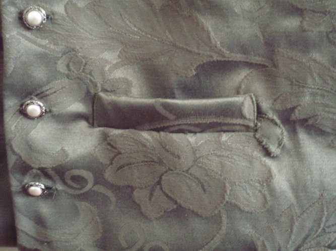 Sage brocade with same fabric on collar, gray cotton lining, pearl-look with silver buttons.