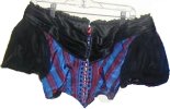 Blue, black, and burgandy plaid taffeta, black satin lining, V-neck no collar,